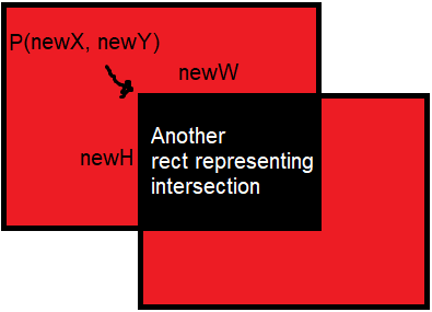 Lets think a bit how we could represent the intersecting area between two squares. Surely, one of the ways to do is simply to represent it as another rectangle, whose color we simply change based on the intercepting area. To draw a rectangle, we need to know the coordinates of the upper left corner, the width and the height. Therefore the challenge is to calculate those as we drag our squares around. This should be done in the draw() function. You already have the intersection check implemented, whats left is to calculate the new rectangle upper left point (newX, newY), width (newW) and height (newH).